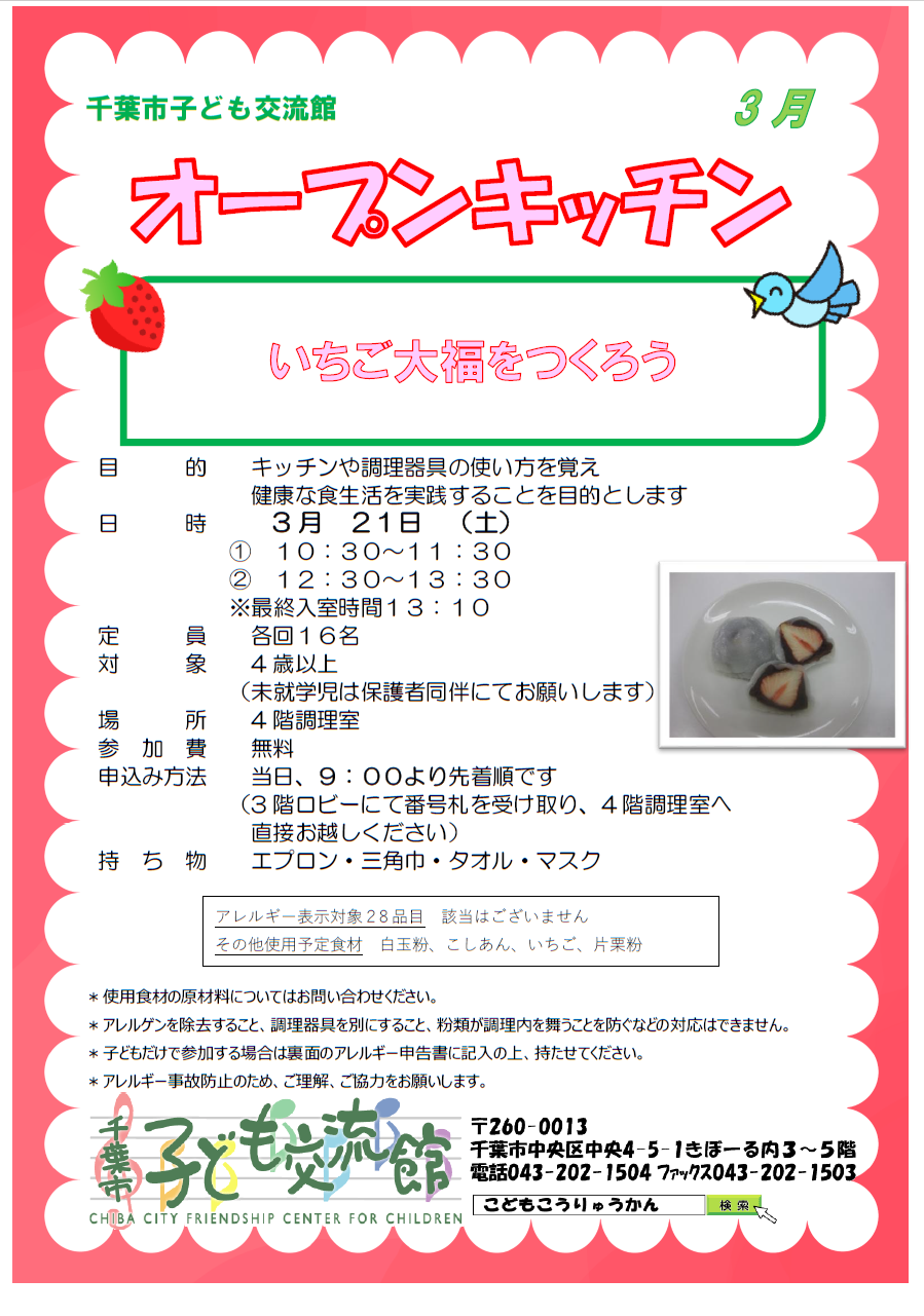 オープンキッチン 「いちご大福をつくろう」(先着 9:00より受付)