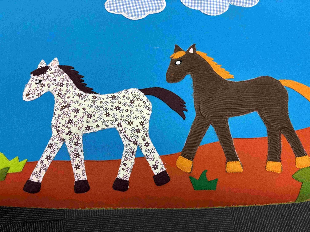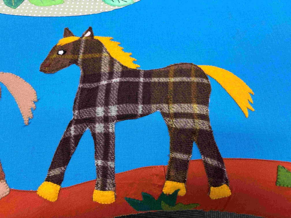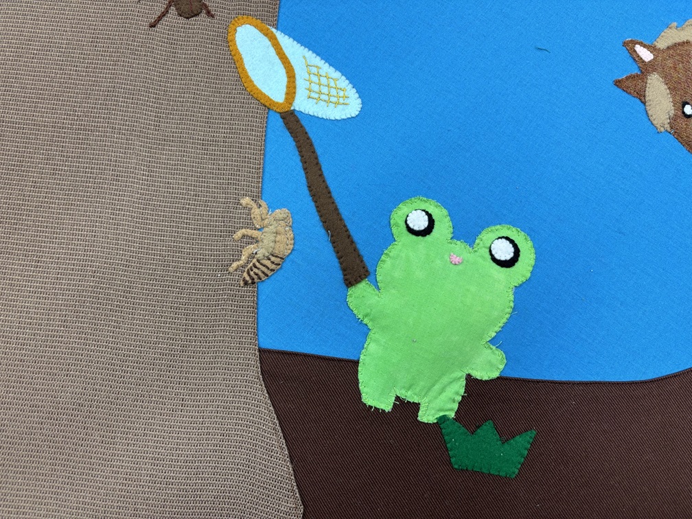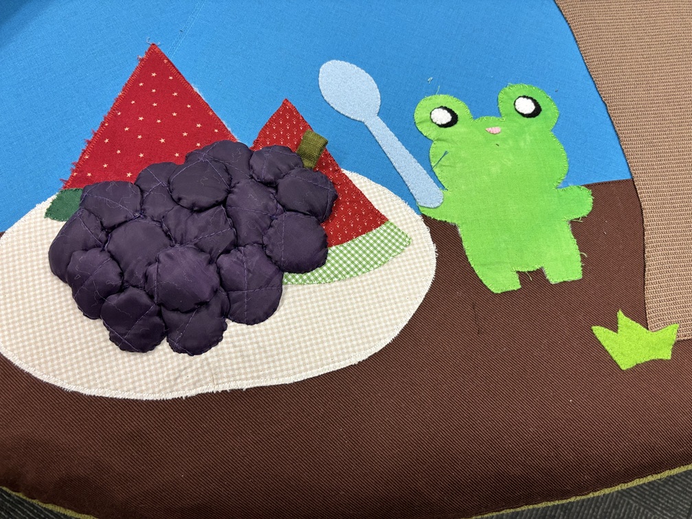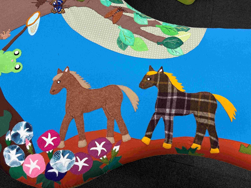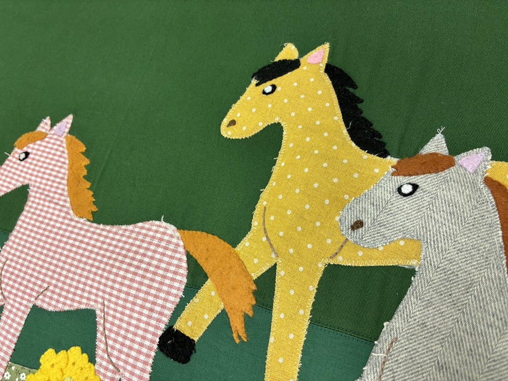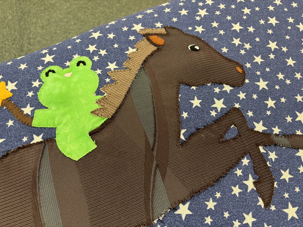 ほころんだ箇所を覆い隠すようにパッチワークを縫い付けています。