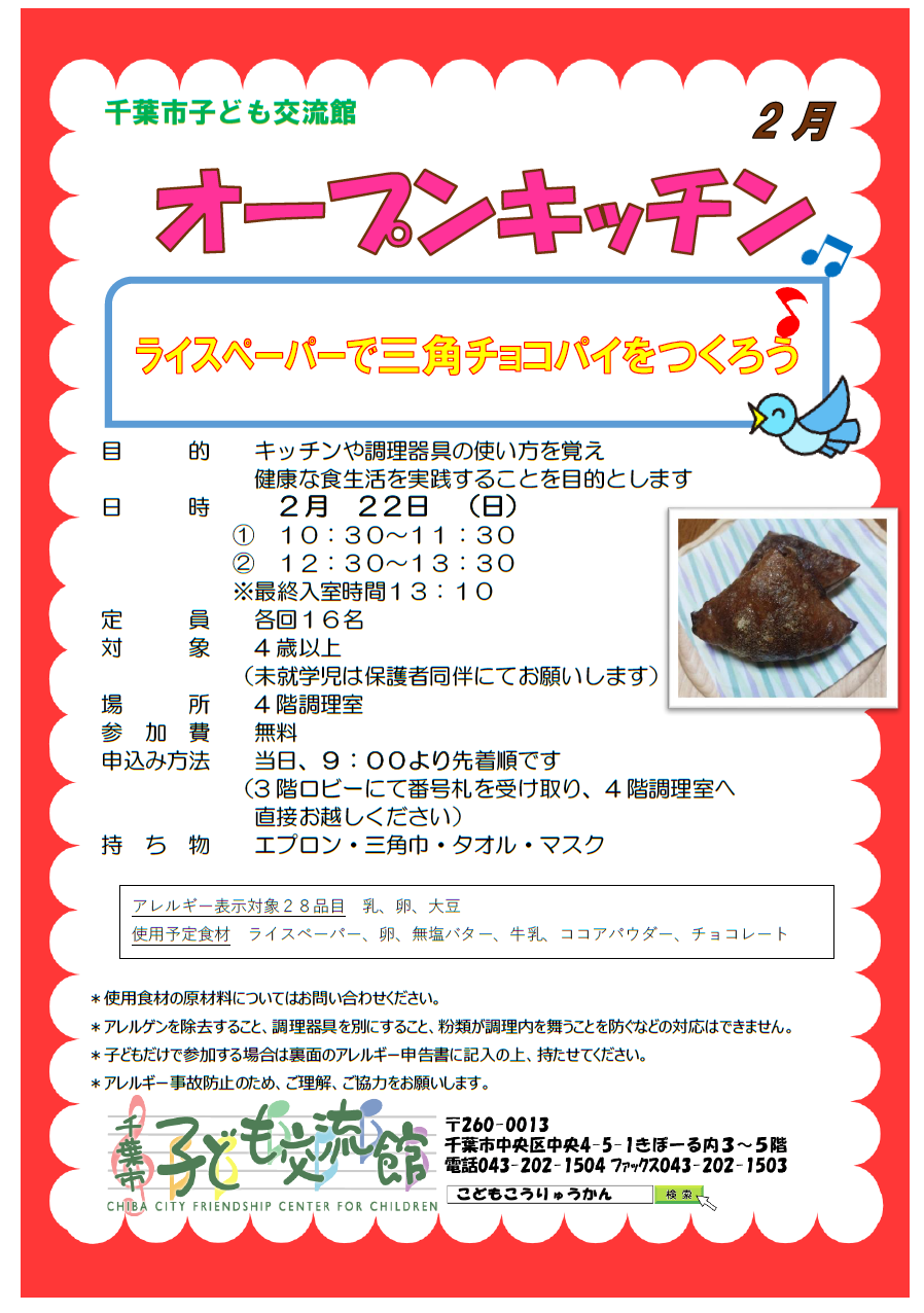 オープンキッチン 「ライスペーパーで三角チョコパイをつくろう」(先着 9:00より受付)