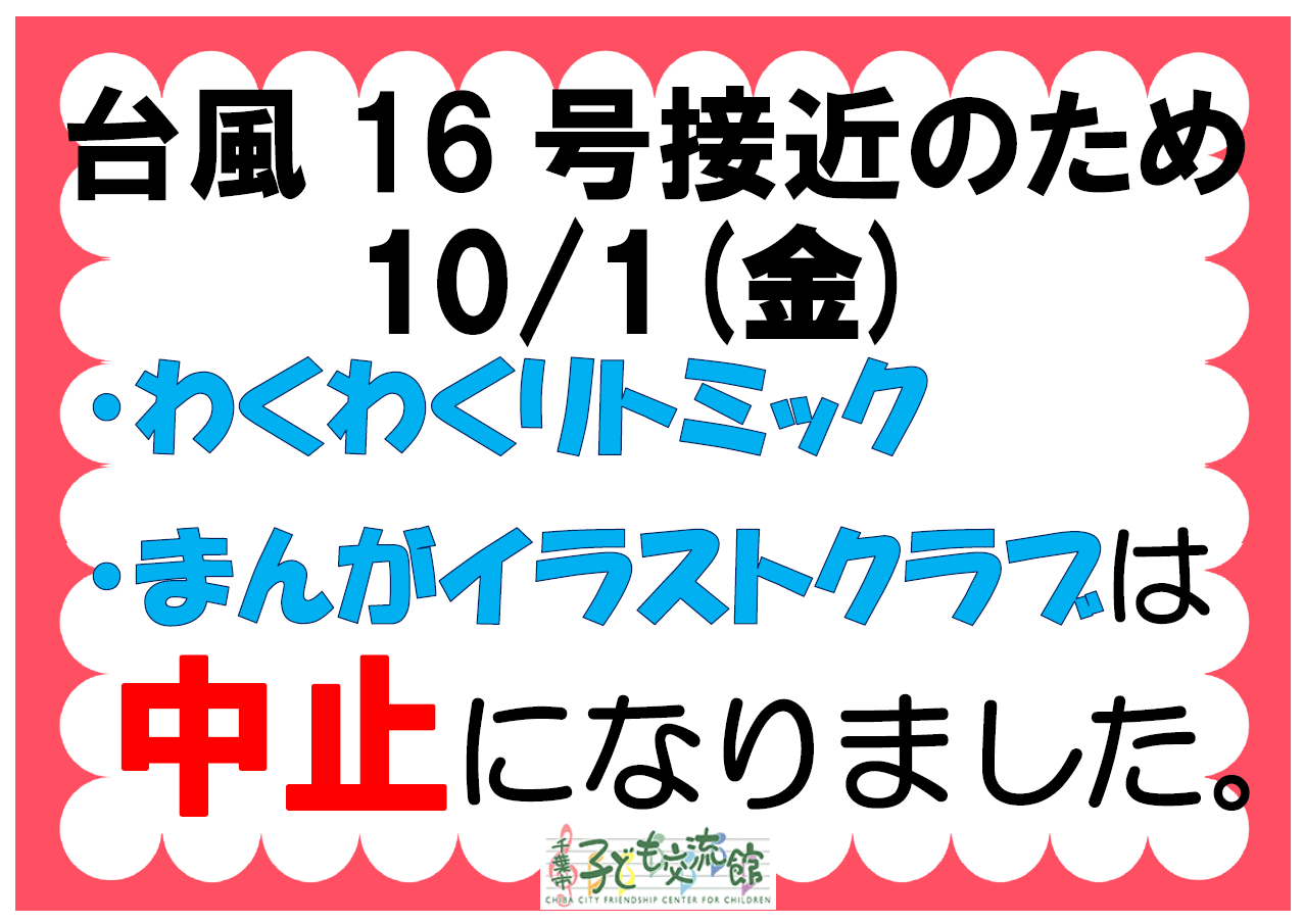 トップページ > トピックス > 【お知らせ】台風16号接近による講座中止について お知らせNEWS 【お知らせ】台風16号接近による講座中止について 10月1日(金)は台風16号接近の影響で、 「わくわくリトミック各クラス」各クラス 「まんが・イラストクラブ」は中止とさせていただきます。 また、暴風雨や交通機関の乱れなどにより、 通常通り開館できない場合もございます。 何卒、ご理解いただきますようお願いいたします。 詳細はSNSやホームページでお知らせいたします。 2021年09月30日 2025年02月 日 月 火 水 木 金 土 1 2 3 4 5 6 7 8 9 10 11 12 13 14 15 16 17 18 19 20 21 22 23 24 25 26 27 28 2025年03月 日 月 火 水 木 金 土 1 2 3 4 5 6 7 8 9 10 11 12 13 14 15 16 17 18 19 20 21 22 23 24 25 26 27 28 29 30 31 2025年04月 日 月 火 水 木 金 土 1 2 3 4 5 6 7 8 9 10 11 12 13 14 15 16 17 18 19 20 21 22 23 24 25 26 27 28 29 30 2025年05月 日 月 火 水 木 金 土 1 2 3 4 5 6 7 8 9 10 11 12 13 14 15 16 17 18 19 20 21 22 23 24 25 26 27 28 29 30 31 2025年06月 日 月 火 水 木 金 土 1 2 3 4 5 6 7 8 9 10 11 12 13 14 15 16 17 18 19 20 21 22 23 24 25 26 27 28 29 30 2025年07月 日 月 火 水 木 金 土 1 2 3 4 5 6 7 8 9 10 11 12 13 14 15 16 17 18 19 20 21 22 23 24 25 26 27 28 29 30 31 2025年08月 日 月 火 水 木 金 土 1 2 3 4 5 6 7 8 9 10 11 12 13 14 15 16 17 18 19 20 21 22 23 24 25 26 27 28 29 30 31 2025年09月 日 月 火 水 木 金 土 1 2 3 4 5 6 7 8 9 10 11 12 13 14 15 16 17 18 19 20 21 22 23 24 25 26 27 28 29 30 2025年10月 日 月 火 水 木 金 土 1 2 3 4 5 6 7 8 9 10 11 12 13 14 15 16 17 18 19 20 21 22 23 24 25 26 27 28 29 30 31 2025年11月 日 月 火 水 木 金 土 1 2 3 4 5 6 7 8 9 10 11 12 13 14 15 16 17 18 19 20 21 22 23 24 25 26 27 28 29 30 ●休館日:火曜日、年末年始12/29~1/3 (火曜日が祝日にあたる場合はその翌日) ※ただし、市内小・中学校の長期休業期間中は開館 千葉市子ども交流館で活動中の高校生が千葉市科学館プラネタリウムで大活躍! 千葉市科学館のご協力のもと、プラネタリウムの星空の下で高校生バンドが演奏をしました! more... Tweets by kodomokoryukan