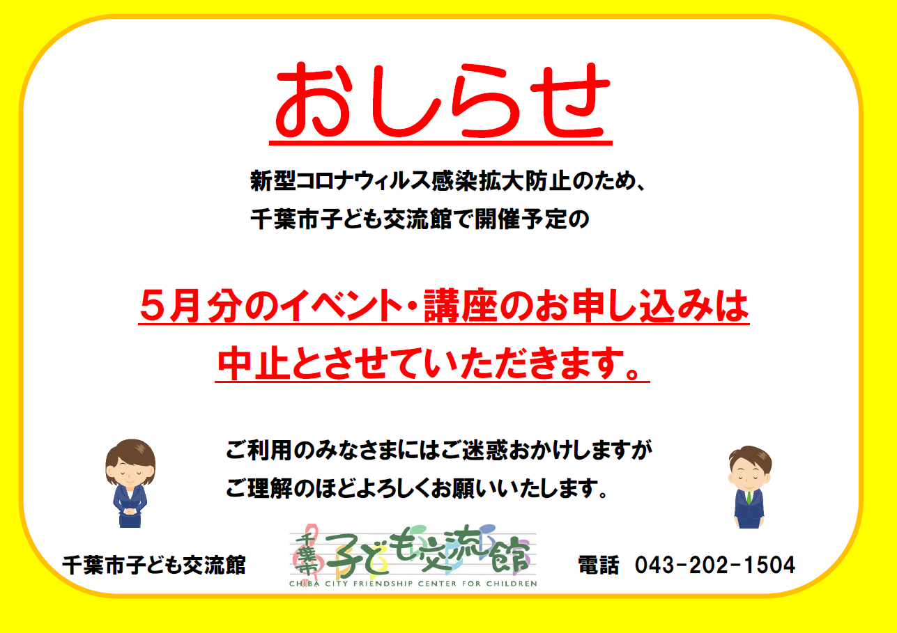 トップページ > トピックス > 【お知らせ】5月の講座申し込みを中止いたします。 お知らせNEWS 【お知らせ】5月の講座申し込みを中止いたします。 いつも千葉市子ども交流館をご利用いただきまして、誠にありがとうございます。 子ども交流館は、新型コロナウィルス感染拡大防止のため臨時休館中ですが 5月の講座申し込みにつきましても、中止とさせていただく事となりました。 4月9日(木)からの講座受付はございません ので、なにとぞよろしくお願いいたします。 ご利用のみなさまにはご迷惑をおかけいたします。 ご理解とご協力をお願いいたします。 2020年04月08日 2025年02月 日 月 火 水 木 金 土 1 2 3 4 5 6 7 8 9 10 11 12 13 14 15 16 17 18 19 20 21 22 23 24 25 26 27 28 2025年03月 日 月 火 水 木 金 土 1 2 3 4 5 6 7 8 9 10 11 12 13 14 15 16 17 18 19 20 21 22 23 24 25 26 27 28 29 30 31 2025年04月 日 月 火 水 木 金 土 1 2 3 4 5 6 7 8 9 10 11 12 13 14 15 16 17 18 19 20 21 22 23 24 25 26 27 28 29 30 2025年05月 日 月 火 水 木 金 土 1 2 3 4 5 6 7 8 9 10 11 12 13 14 15 16 17 18 19 20 21 22 23 24 25 26 27 28 29 30 31 2025年06月 日 月 火 水 木 金 土 1 2 3 4 5 6 7 8 9 10 11 12 13 14 15 16 17 18 19 20 21 22 23 24 25 26 27 28 29 30 2025年07月 日 月 火 水 木 金 土 1 2 3 4 5 6 7 8 9 10 11 12 13 14 15 16 17 18 19 20 21 22 23 24 25 26 27 28 29 30 31 2025年08月 日 月 火 水 木 金 土 1 2 3 4 5 6 7 8 9 10 11 12 13 14 15 16 17 18 19 20 21 22 23 24 25 26 27 28 29 30 31 2025年09月 日 月 火 水 木 金 土 1 2 3 4 5 6 7 8 9 10 11 12 13 14 15 16 17 18 19 20 21 22 23 24 25 26 27 28 29 30 2025年10月 日 月 火 水 木 金 土 1 2 3 4 5 6 7 8 9 10 11 12 13 14 15 16 17 18 19 20 21 22 23 24 25 26 27 28 29 30 31 2025年11月 日 月 火 水 木 金 土 1 2 3 4 5 6 7 8 9 10 11 12 13 14 15 16 17 18 19 20 21 22 23 24 25 26 27 28 29 30 ●休館日:火曜日、年末年始12/29~1/3 (火曜日が祝日にあたる場合はその翌日) ※ただし、市内小・中学校の長期休業期間中は開館 千葉市子ども交流館で活動中の高校生が千葉市科学館プラネタリウムで大活躍! 千葉市科学館のご協力のもと、プラネタリウムの星空の下で高校生バンドが演奏をしました! more... Tweets by kodomokoryukan