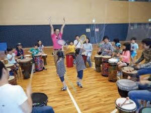 アフリカのたいこ「ジャンベ」やエコ楽器などをファシリテーターにならってみんなで演奏します。
