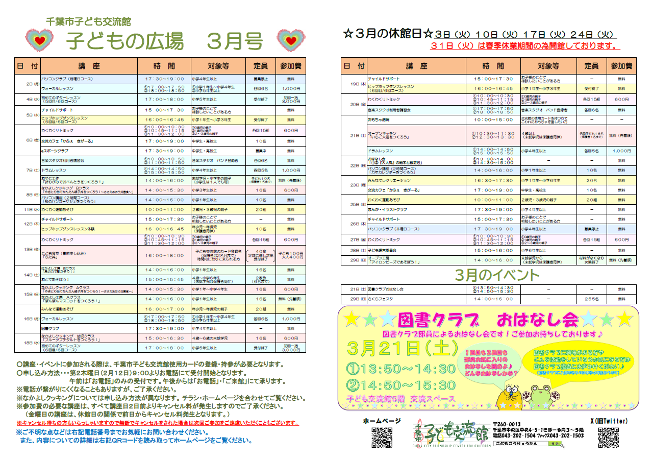 3月開催予定の講座・イベント情報をUPいたしました。(2/1)
